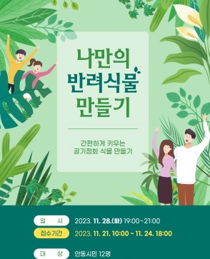 (경북=NSP통신) 김오현 기자 = 안동시립웅부도서관은 11월 ‘문화가 있는 날’을 맞아 초록색 힐링 ‘나만의 반려식물 만들기’라는 주제로 1일 강좌를 개설한다.