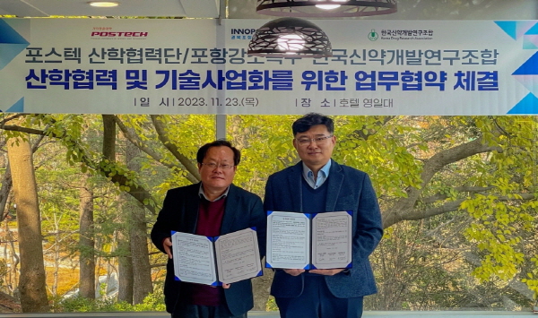 포항강소특구육성센터는 23일 포스텍산학협력단, 한국신약개발연구조합과 제약·바이오 분야 기술사업화를 위한 업무협약을 체결했다. (사진 = 포항시)