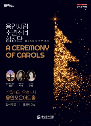 용인시립소년소녀합창단 제43회 정기연주회 ‘A Ceremony of Carols(캐럴의 축제)’ 공연은 만 5세 이상 관람 가능하며 전석 무료 공연으로 오는 27일 오후 1시부터 12월 7일 오후 3시까지 용인문화재단 홈페이지 내 공연 상세페이지에서 사전 예약(댓글 이벤트)으로 진행된다.