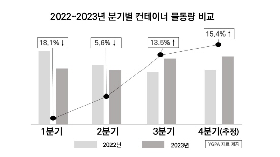 2023년 ‘컨’ 물동량 전년 대비 분기별 증감률 추이를 살펴보면, 1분기의 경우 18.1%↓, 2분기 5.6%↓, 3분기 13.5%↑, 4분기 15.4%↑로 하반기 증가세를 보이고 있다.