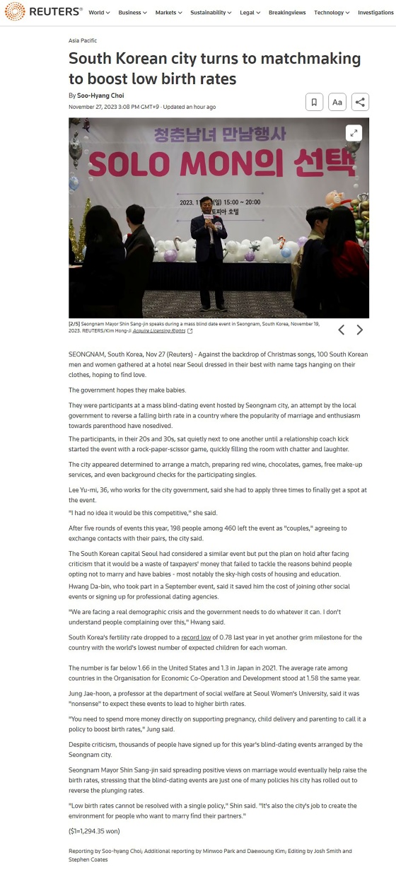 신상진 시장은 로이터와 인터뷰에서 “결혼에 대한 긍정적인 시각을 확산시키고 결혼을 원하는 사람들이 가정을 꾸리고 자식을 둘 수 있는 환경을 조성하는 것도 시가 해야 할 역할”이라고 강조했다.
