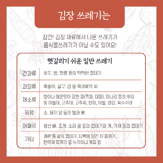 주요 내용은 김장철 시기 동안 채소를 다듬는 과정에서 나오는 통배추, 배춧잎, 쪽파·대파, 양파 등의 뿌리나 껍질 등 이물질이 묻은 채소류는 종량제봉투에 배출해야 한다.