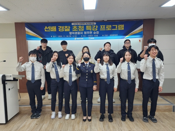 (경북=NSP통신) 조인호 기자 = 포항 선린대학교(총장 곽진환) 경찰행정과는 지난 11월 30일 화평관 102호에서 2023년 전문대학 혁신지원사업의 일환으로 본과를 졸업한 선배인 영덕경찰서 정주현 순경을 초청하여 ‘선배경찰 초청 특강 프로그램’ 을 실시했다.