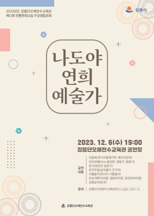 (강원=NSP통신) 조이호 기자 = 강원특별자치도 강릉시(시장 김홍규) 강릉단오제전수교육관이 6일 오후 7시 강릉단오제전수교육관 공연장에서 2023년도 전통문화교실 제12회 수강생발표회 ‘나도야 연희예술가’를 개최한다.