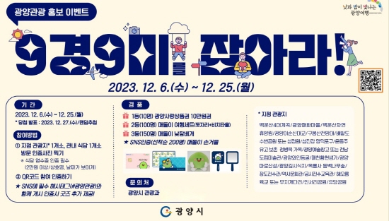 오는 6일부터 지정관광지, 지역 내 식당 각각 1개소 이상을 방문하고 사진을 QR코드로 인증하면 추첨을 통해 상품을 지급하는 ‘광양 9경 9미를 잡아라’ 이벤트를 12월 25일까지 추진한다고 밝혔다.