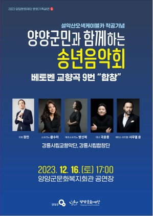 (강원=NSP통신) 조이호 기자 = 강원특별자치도 양양군(군수 김진하)과 양양문화재단(이사 김호열)이 주최하고 강릉시립교향악단과 강릉시립합창단 그리고 성악가 등 100여 명이 출연하는 ‘2023 문화기획공연·6 양양군민과 함께하는 송년음악회’가 오는 16일 오후 5시 문화복지회관 공연장에서 개최된다.