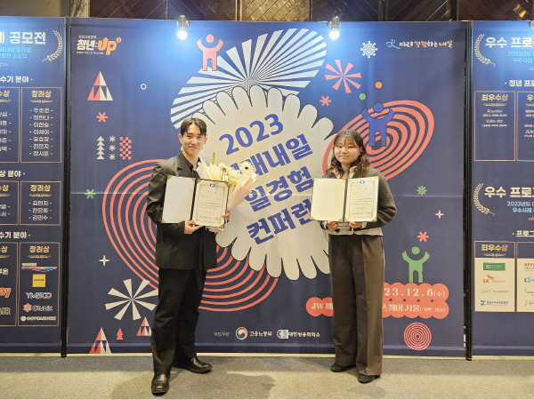시상식은 지난 6일 JW메리어트 동대문 스퀘어에서 개최된 ‘제1회 미래내일 일경험 콘퍼런스’에서 진행됐으며 물리치료과 노하준 씨(만 27세)와 정시훈 씨(만 21세)가 청년 수기 부문 우수상과 장려상을, 김한별 씨(만 19세)가 청년 영상 부문 우수상을 차지하며 대회 3관왕을 차지했다.