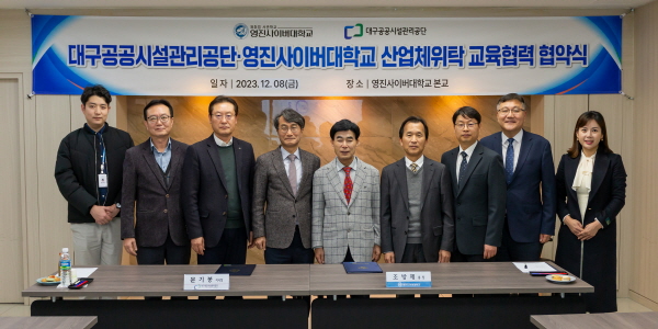 대구공공시설관리공단과 영진사이버대학교는 주문식교육을 통한 공단 임직원들의 평생교육을 적극적으로 지원하기로 뜻을 모으고, 8일 오후 대구 북구 복현동 이 대학교 본교 캠퍼스 회의실에서 산학협력 협약을 체결했다.