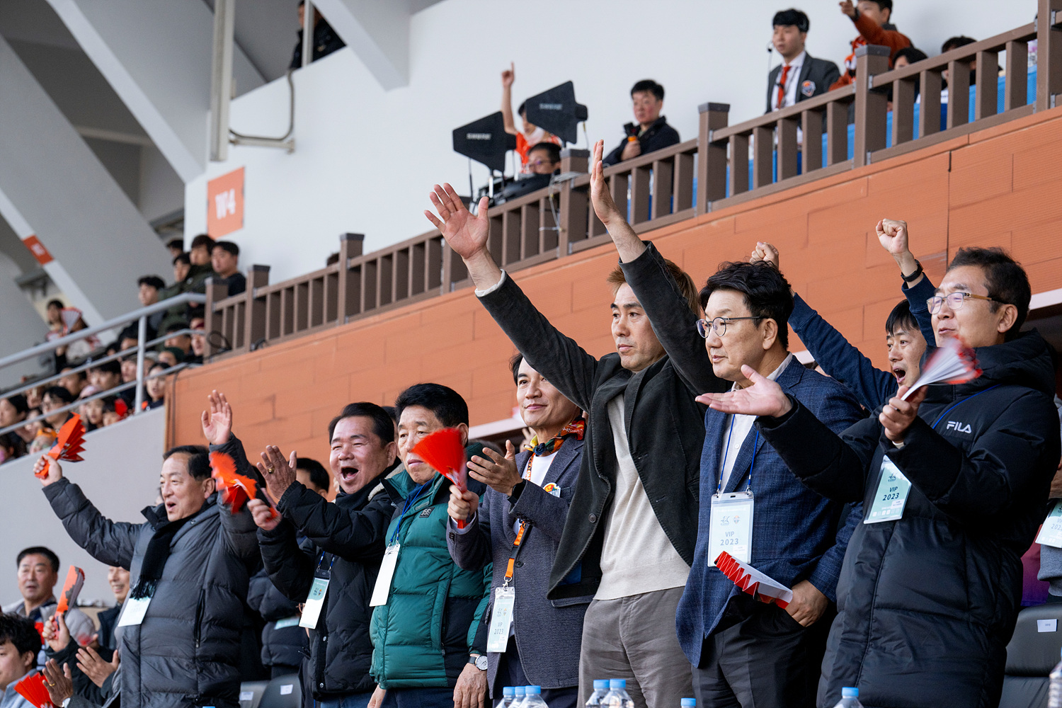 이날 김진태 지사, 권성동 국회의원, 김홍규 강릉시장, 이병선 속초시장, 신경호 교육감 등 도내 지자체장 등 내빈들이 총 출동한 가운데 1만 130여 명의 도민들이 구장을 가득 메우며 선수들에게 힘을 보탰다.