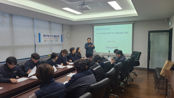 NSP통신-포항상공회의소 경북동부FTA통상진흥센터는 12일 영천소재 삼양연마공업 회의실서 회사 임직원들이 참석한 가운데 찾아가는 FTA 활용교육을 진행했다. (사진 = 포항상공회의소)