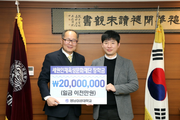 세원그룹 및 세원인재육성문화재단은 영남이공대학교에 2020년 1000만원, 2021년 1000만원, 2022년 2000만원의 장학금을 기탁했으며, 올해도 어김없이 스마트융합기계계열의 발전과 미래 인재 양성을 위한 장학금 2000만원을 기탁했다.