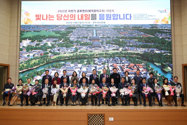 퇴직자는 △박원철 문화관광국장 △최재순 보건소장 △금창석 사적관리과장 △배경발 현곡면장 △최진열 세정과장 △이활우 의회사무국 전문위원 △김진영 도시공원과장 △신진욱 수도행정과장 △이태익 폐철도활용사업단장 △이규대 동궁원장 △이원영 에코물센터장 △윤병숙 안강읍 세정팀장 팀장 △정은하 월성동 맞춤형복지팀장 △정재환 칠평도서관팀장 △조중래 건천읍 산업팀장 △권혁우 교통행정과 교통지도팀장 △최창환 자원순환과 △이상락 사적관리과 청원경찰 등 18명이다.
