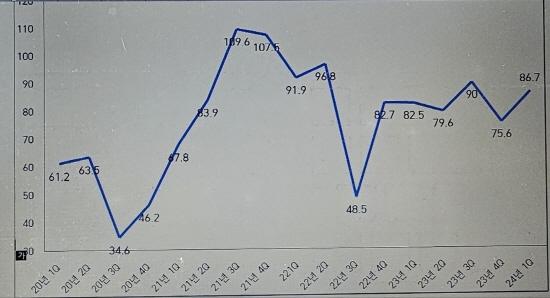 2023년 4/4분기(75.6P) 대비 11.1P 상승하였으나, 기업경기전망지수(BSI)가 100 이하를 기록해 9분기(2022년1분기~2024년1분기) 연속 불황이 장기화 될 것으로 예상했다.