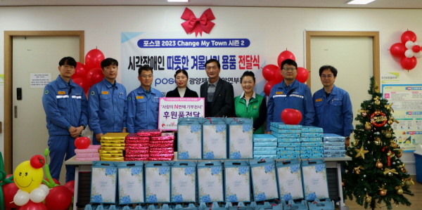 포스코 광양제철소 압연부문 임직원은 지난 27일 한국시각장애인협회 광양시지회를 방문해 겨울내의, 무릎담요, 수면양말로 구성된 셋트(50명분)와 소고기, 굴, 떡국 등 총 300만원 상당을 따뜻한 연말 분위기와 새해 소망을 담은 희망메세지를 전달했다.