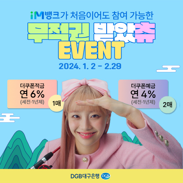 (대구=NSP통신) 최병수 기자 = DGB대구은행(139130)은 새해를 맞아 고금리 예적금 상품인 iM뱅크 ‘더쿠폰 예적금 이벤트’를 실시하고, 가입 고객을 대상으로 최신 디지털 기기를 추첨 증정하는 ‘2024 무적권 드리츄’ 이벤트를 실시한다.