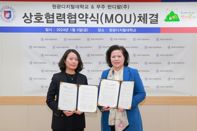 원광디지털대와 무주반디팜 간 ‘웰니스 관광 발전 지향’ 업무협약식에서 최은지 원광디지털대 입학협력처장(왼쪽)과 소현주 무주반디팜 대표가 협약 기념촬영을 하고 있다. (사진 = 원광디지털대)