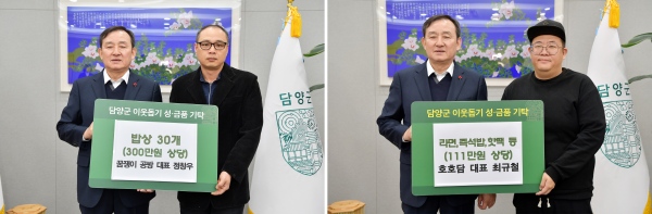 (전남=NSP통신) 김용재 기자 = 담양군은 꿈쟁이 공방(대표 정창우)이 밥상 30개(300만 원 상당), 호호담(대표 최규철)이 라면, 즉석밥, 핫팩 등(111만 원 상당)을 기탁했다고 11일 전했다.