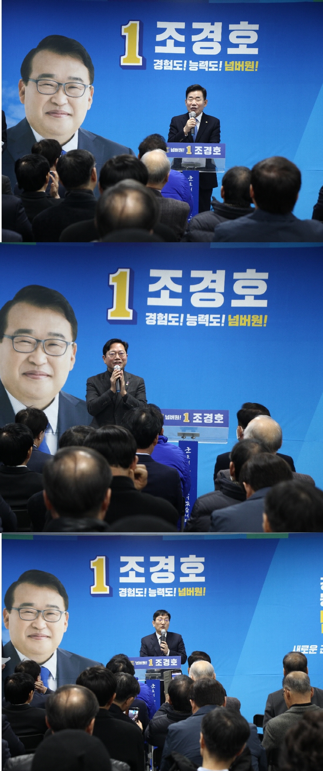 김진표 국회의장은 “조경호 비서실장, 저는 이렇게 부르고 싶다. 여러분 잘 아시는 것처럼 조경호 예비후보는 지난주까지 국회의장 비서실장으로 일했다. 제가 국회의원으로 일할 때는 보좌관으로, 국회의장이 된 이후에는 정무수석과 비서실장으로 지근거리에서 동고동락해 온 귀한 인연”이라며 “조경호 예비후보는 보통 사람이 갖추기 힘든 국내외 여러 가지 정세들을 미리미리 예측하고 평가할 줄 아는 능력과 현실에 뿌리를 둔 민생경제 어려움을 해결할 수 있는 정책 대안을 제시할 능력을 갖추고 있어 실사구시 할 수 있는 인재라고 생각한다”고 말했다.