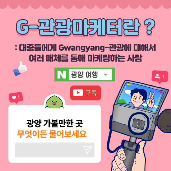 G-관광마케터는 유튜브 영상, 블로그, 페이스북, 인스타그램 등의 매체를 통해 광양관광 정보 확산 및 브랜딩을 수행하게 되며 월 최대 14만 원을 지원받게 된다.