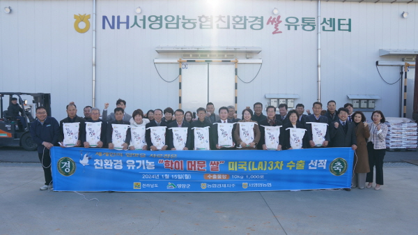 (전남=NSP통신) 강현희 기자 = 영암군(군수 우승희)이 지난 15일 서영암농협친환경쌀유통센터에서 친환경 유기농으로 생산한 ‘학이머문쌀’ 10톤의 미국 수출 3차 선적식을 가졌다.