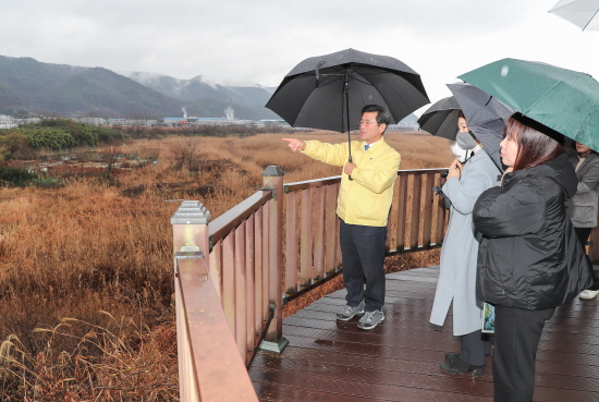 현장에서 정 시장은 정확한 측량을 통해 원래의 물길을 살리고 육지구역, 습지 구역의 생태환경을 최대한 보존하되 불법 경작지, 잡목의 깔끔한 정비와 생육·토질환경을 고려한 나무 식재 계획 등을 지시했다.