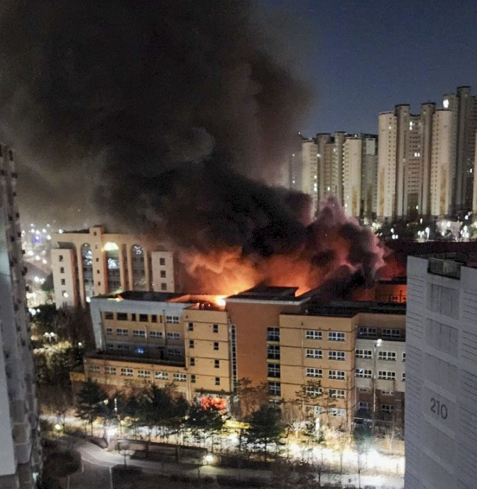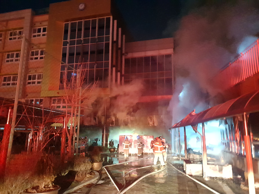 이날 화재는 경비원 이모씨가 야간 근무 중 화재 경보벨 소리가 들려 확인 중 본관동과 별관동을 연결된하는 필로티 구조의 연결 통로 천장에서 불꽃이 보여 신고한 것으로 알려졌다.