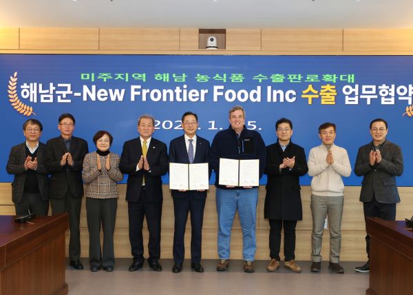 명현관 해남군수와 김석순 군의회 의장, 뉴프런티어푸드 이신형, 로버트 모크 공동대표, 땅끝황토친환경영농조합 윤영식 대표 등 관계자가 참석한 가운데 열린 업무협약식에서는 해남산 농식품 수출확대와 상생협력모델 발굴을 위한 수출 업무협약을 체결하고 수출확대에 적극 협력해 나가기로 했다.