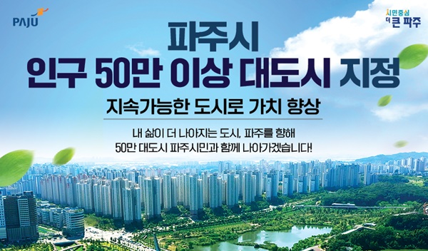 (서울=NSP통신) 강은태 기자 = 파주시가 2022년 5월 31일 주민등록 인구에 등록외국인과 국내거소신고 외국 국적 동포를 포함해 인구 50만 명을 넘어선 이후로 대도시 지정 요건인 인구 50만 명을 2년 연속 초과해 ‘지방자치법 시행령’ 제118조에 따라 대도시로 지정됐다.