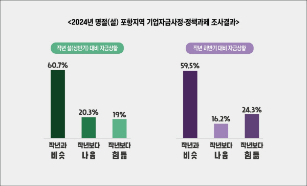 30일 포항상공회의소의 ‘2024년 설 포항지역 기업자금사정과 정책과제 조사결과’에 따르면 지난해 설(상반기)과 비교해 ‘비슷(60.7%)’, ‘나음(20.3%)’, ‘힘듦(19%)’ 순으로 나타났다.