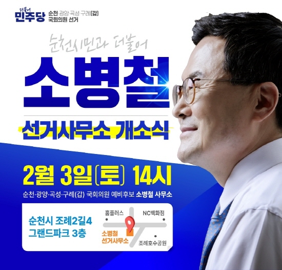 (전남=NSP통신) 김성철 기자 = 소병철 더불어민주당 순천(갑) 국회의원 예비후보가 오는 2월3일 오후 2시 조례동에 위치한 선거사무소 개소식을 예고하며 4월 총선서 필승의지를 다진다.