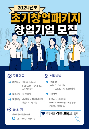 (경북=NSP통신) 김대원 기자 = 경북대는 중소벤처기업부에서 시행하는 2024년 초기창업패키지사업에 참가할 창업기업을 모집한다.