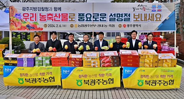 (광주=NSP통신) 김용재 기자 = 농협광주본부(본부장 이현호)는 6일 ‘우리고장 먹거리 소비촉진 협약’을 맺고 매년 지역 농축산물 소비촉진에 앞장서고 있는 광주지방검찰청(지검장 박종근) 앞마당에서 ‘설 명절 농·축·특산물 직거래 큰 장터’를 개장했다.