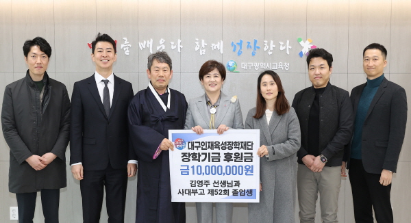 (경북=NSP통신) 김대원 기자 = 대구시교육청(교육감 강은희)은 8일 비슬고 김영주 교장과 경대사대부고 제52회 졸업생 11명이 함께 마련한 장학금 1천만 원을 대구인재육성장학재단에 기탁했다고 밝혔다.