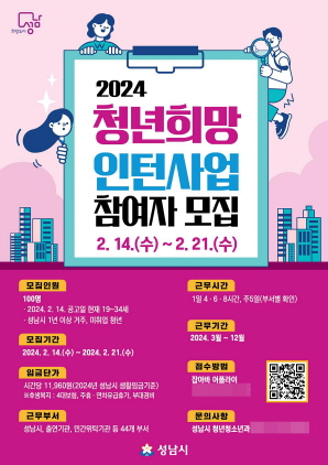 (경기=NSP통신) 김병관 기자 = 경기 성남시(시장 신상진)는 14일부터 오는 21일까지 ‘청년 희망 인턴 사업’ 참여자 100명을 모집한다.