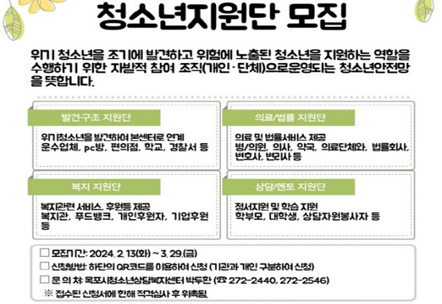 (전남=NSP통신) 윤시현 기자 = 목포시 청소년상담복지센터가 위기 청소년들의 안전한 성장 지원을 위한 ‘1388청소년지원단’을 13일부터 오는 3월 29일까지 공개 모집한다.