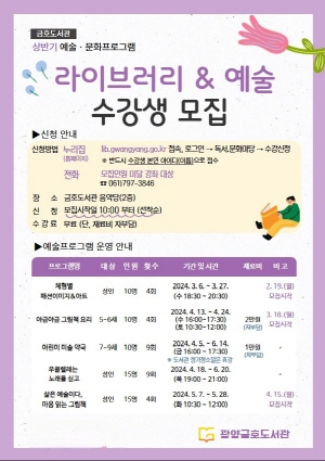 (전남=NSP통신) 김성철 기자 = 광양금호도서관은 3월~6월까지 운영하는 상반기 예술·문화 프로그램 ‘라이브러리&예술’ 수강생을 2월 19일부터 모집한다.