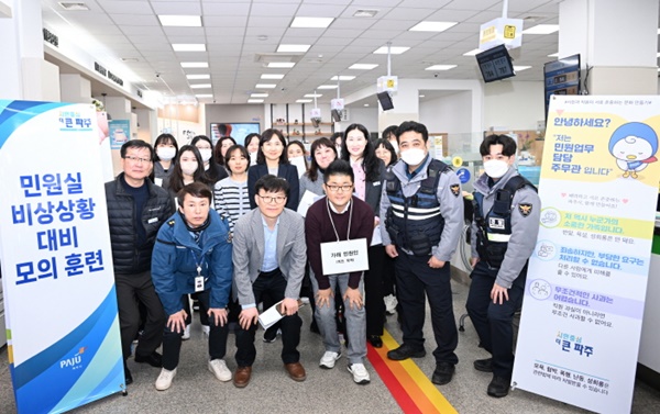 특히 민원실 비상벨 시연은 파주경찰서의 협조를 얻어 폭력 상황 등 긴급상황 발생 시 비상벨 알림으로 경찰관이 신속히 출동해 가해 민원인을 제압하는 상황을 연출해 훈련의 효과를 높였다.