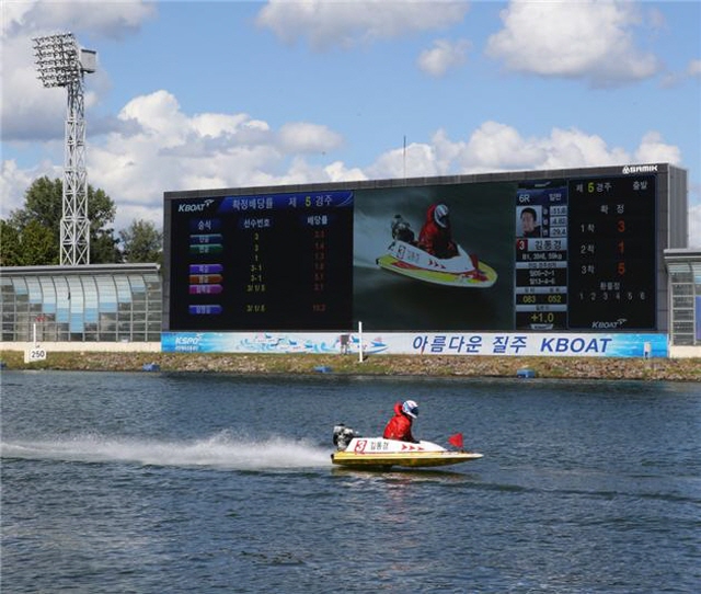 미사리경정장에서 경정선수가 다음경주 출전을 위해 소개항주를 진행하고 있다. (사진 = 국민체육진흥공단)