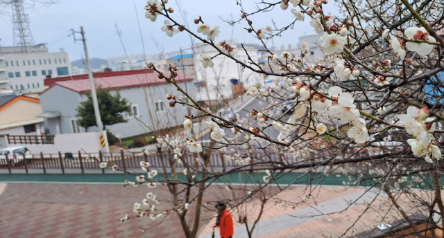 동목포역 인근 매화는 수수한 자태를 뽐내며 봄이 가까이 다가왔다고 지역민들에게 봄소식을 전한다.