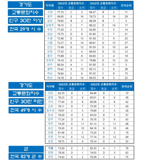 경기도 권에서는 파주시가 유일하게 A등급을 받았고 이중 의왕시의 개선 효과가 두드러졌는데 교통관련 컨설팅 등을 진행한 결과 2022년 E등급(73.2점)에서 2023년 C등급(81.46점)으로 향상됐다.