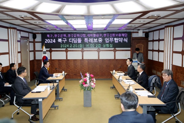 20일 북구에 따르면 이날 북구청 2층 상황실에서 ▲광주은행 ▲북구 지역 새마을금고(11개소) ▲광주문화신협 ▲광주신용보증재단 등 총 15개 기관 관계자가 참여한 가운데 ‘북구 소상공인 디딤돌 3無 특례보증 업무 협약’이 체결됐다.