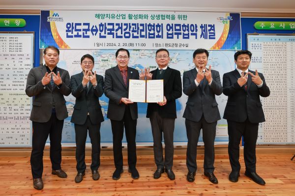 (전남=NSP통신) 김현 기자 = 전남 완도군은 2월 20일 한국건강관리협회와 해양치유산업 활성화를 위한 업무 협약을 체결했다.