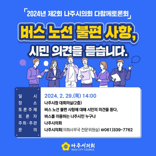 (전남=NSP통신) 김용재 기자 = 나주시의회(의장 이상만)가 오는 29일 오후3시 나주시청 2층 대회의실에서 ‘2024년 제2회 나주시의회 다함께 토론회’를 개최한다.