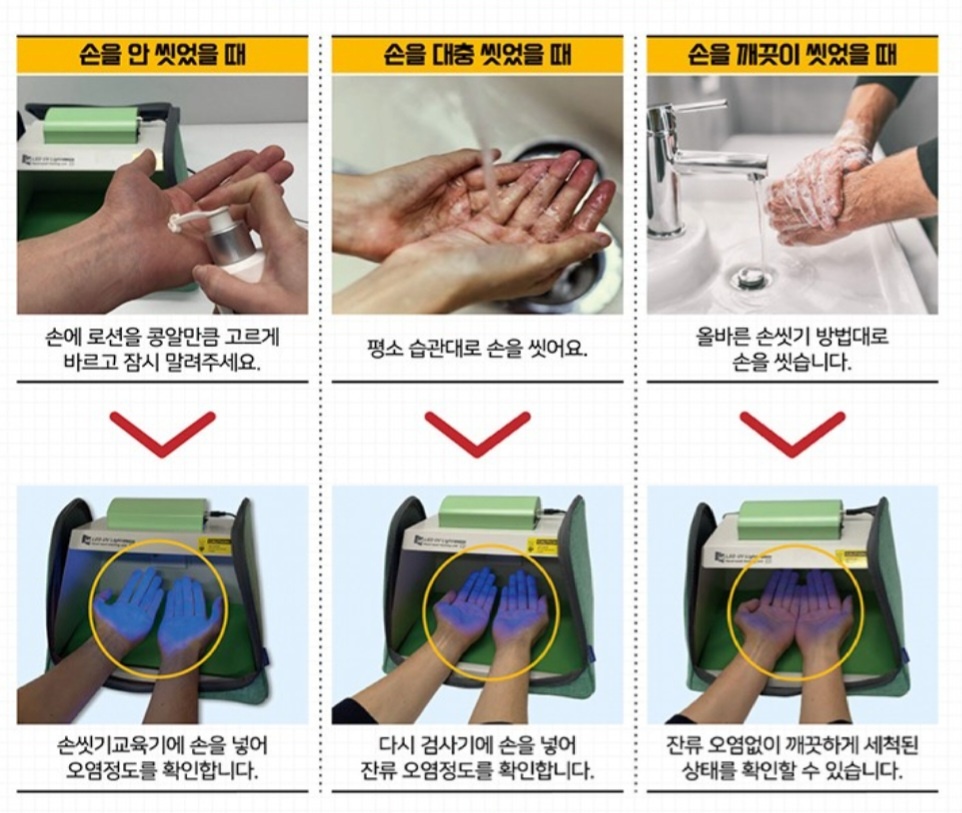 ‘올바른 손씻기’ 방법을 익히고 다시 뷰박스를 이용해 깨끗해진 손을 확인하는 방식으로 교육이 이뤄진다.