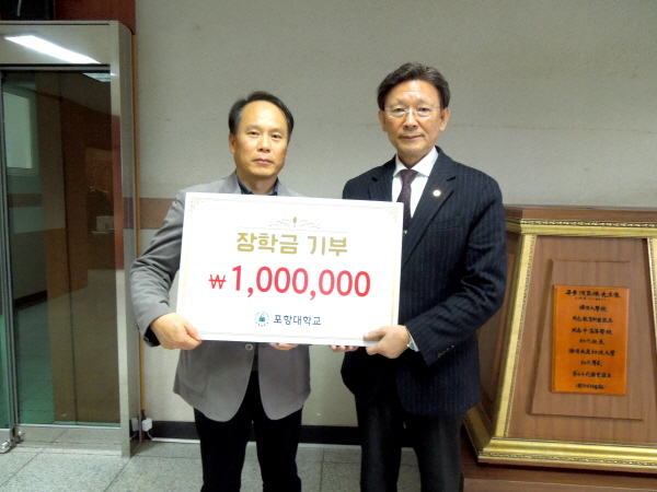 (경북=NSP통신) 조인호 기자 = 포항대학교(총장 하민영)는 23일 교내 평보관 2층 총장실에서 장학금 전달식을 진행했다.