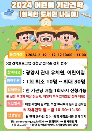 참가를 희망하는 기관은 매월 세번째 월요일부터 광양시립도서관 누리집을 통해 신청 가능하며, 4세 이상을 대상으로 하고 한 회당 최대 30명 이내로 신청하면 된다.