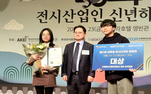 이 대학교 인테리어디자인과 안지수, 장화진 학생(2년, 네모의 꿈팀)은 이날 저녁 신라호텔 영빈관에서 개최된 ‘2024 전시산업인 신년하례회’ 행사 중 ‘제11회 대학생 전시디자인 공모전’ 시상서 대상인 산업통상자원부 장관상을 받았다.