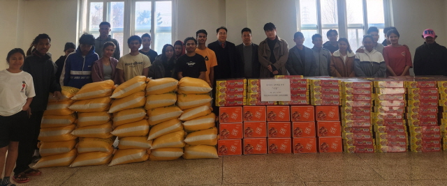 (전남=NSP통신) 윤시현 기자 = 영암군 외국인주민지원센터(정두배센터장)와 주식회사 한길씨엔씨(박용호대표이사)는 유학생활에 어려움을 겪고 있는 세한대학교 동티모르 유학생을 위해 쌀 600kg, 김치300kg, 컵라면 720개 등을 기부해 유학생들의 한국생활 적응에 적극 격려했다.