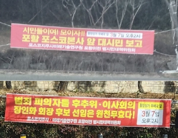 최근 범대위는 포스코 회장 선임에 반대하는 대규모 집회를 열겠다고 공표하고, 시내 곳곳에 붉은색 현수막을 내걸었습니다. 명분 없는 주장들을 쏟아내며 의미 없는 흠집내기와 혐오에만 몰두하고 있는 모습은 글로벌 기업의 본사를 보유하고 있다는 포항시민들의 자부심과 지난 반세기 포스코와 포항시가 함께 발전해 온 상생의 역사를 무시하는 것으로 밖에 보여지지 않습니다.