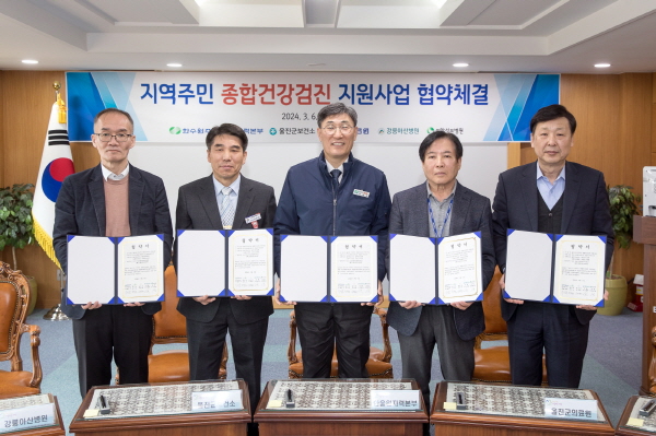 (경북=NSP통신) 조인호 기자 = 한울원자력본부(본부장 이세용)는 6일 울진군보건소(소장 남화모), 울진군의료원(원장 조영래), 강릉아산병원(원장 유창식), 포항성모병원(원장 손경옥)과 2024년도 울진군 지역주민 종합건강검진 지원을 위한 협약을 체결했다.